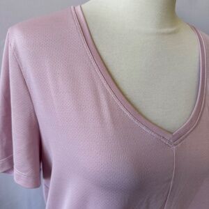 Womens size Medium, lilac pink, tie waist, short sleeves, v-neck, recycled polyester.