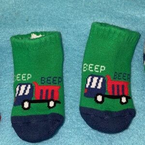 INFANT socks monster truck dump truck stripes cozy comfy, 3 pair. Brighten up your child's wardrobe with this colorful set of kids' socks. Featuring playful designs in red, green, blue, and gray, these socks are perfect for everyday wear.