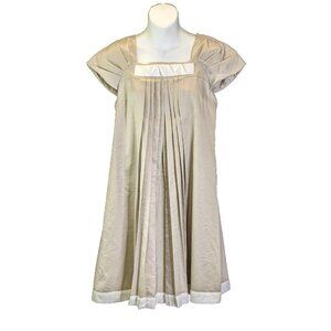 It features a crew neck, cap sleeves, with satin ribbon trim accents. The dress is knee-length and has an A-line style, with a baby doll silhouette and pleats front and back. It is lined and suitable for formal occasions, parties, and travel. Made in France.