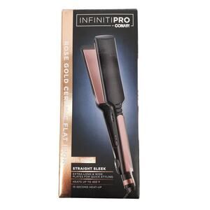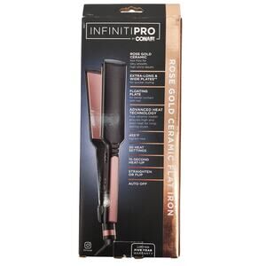 New INFINITIPRO BY CONAIR Rose Gold Ceramic Flat Iron Size 1 3/4in. Extra long and wide plates, advanced heat technology, 15 second heat up, 30 heat settings, auto off.