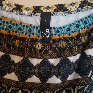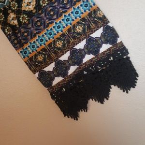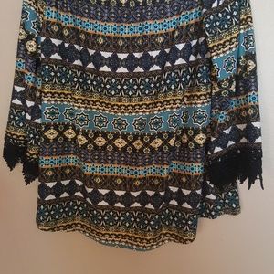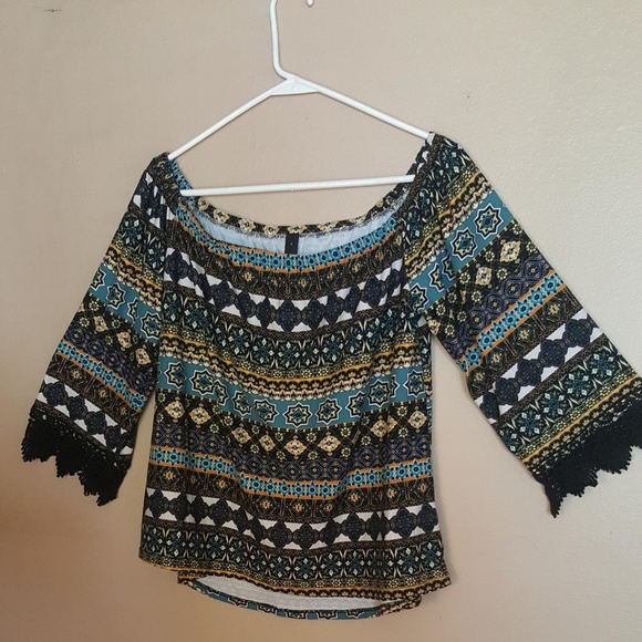 ING Bohemian style top, measures 22 1/2 inches armpit to armpit, 22 inches in length. Fabric content 95% polyester, 5% spandex, super luxe knit fabric stretching all ways. Lace accents at bottom of sleeves. Can be worn on or off the shoulder. Practically new condition.