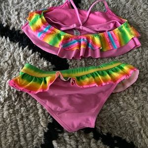 This bikini is from INGEAR SWIM it is pink and rainbow ruffles with pink straps.