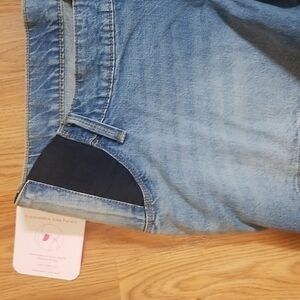Isabel maternity midi shorts in a light wash. These shorts have expandable side panels that grow with your baby. Working zipper fly and button closure. 4 inch inseam. This brand suggest ordering your pre pregnancy size.