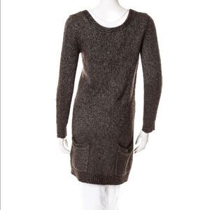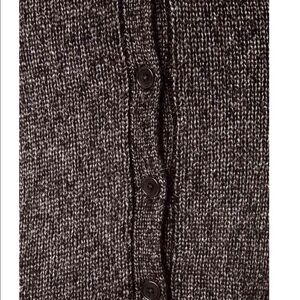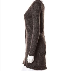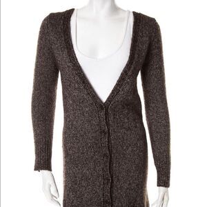 Brown and silver knit cardigan with bottom closure at back and dual front pockets. Originally $375