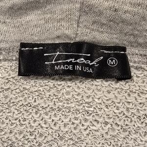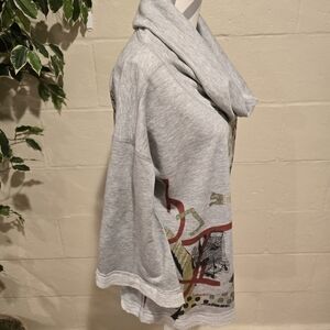 This is a stylish INOAH cowl neck sweatshirt in size Medium with a unique art pattern. It features 3/4 bell sleeves and an oversized fit, perfect for summer, fall, or spring seasons. The sweatshirt is in a gray color and made of blended fabric. Ideal for casual wear or activities like walking or at the beach.