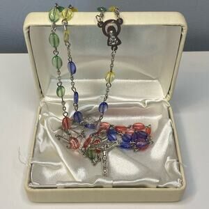INRI ITALY Vintage Rosary Multi Color Beads Silvertone Necklace Prayer