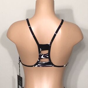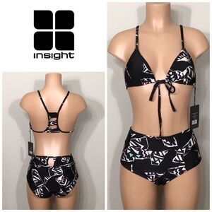 Ladder back top halter top with high waisted bottoms. Sliding triangle that ties in the front. Removable pads. Bottoms fully lined hi-waisted. Strong supportive fabric. Black, purple, green, red.
