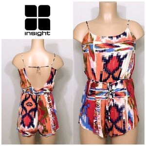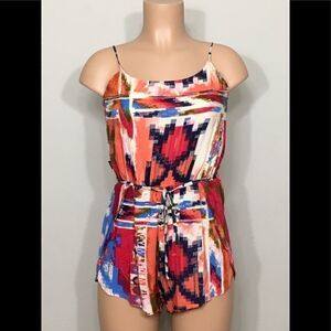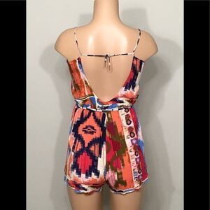Darling romper in multicolors. Red, blue, orange, and ivory. Shorts have side wrap design. Adorable