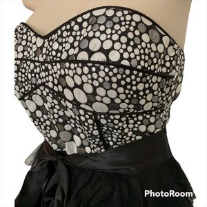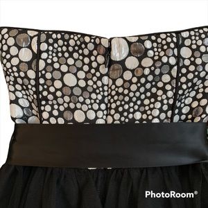 Style: Flattering Mini Fit & Flare dress with strapless sweetheart neckline, bodice has a metallic circle pattern with decorative piped seams that are figure flattering and add texture (seams are on the back, as well), slightly padded cups and comes with a thin silicone rubber strip that lines the entire inside top seam to hold the dress up, a black silk ribbon enhances the waist and can be tied in the front, back, side or can be worn without, the skirt is multiple layers of tulle over a satin-like lining, zipper, hook & eye closure up back
