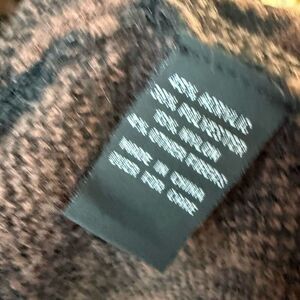 I.N. Studio long line, acrylic, polyester, nylon and other fiber open front cardigan with all over patchwork style brown, and black houndstooth pattern. Patch pockets at the hip. Laying flat measures approximately 37 inches shoulder to hem and 20 inches armpit to armpit with the open seam touching.