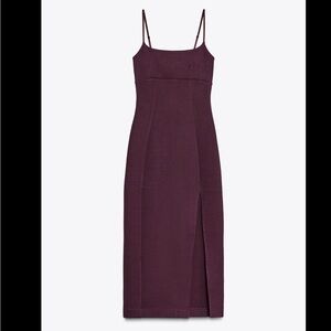 NWT. Midi dress made of soft, compact, opaque stretch knit fabric. Straight neckline and spaghetti straps. Front slit at hem.