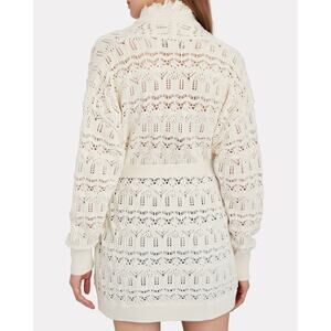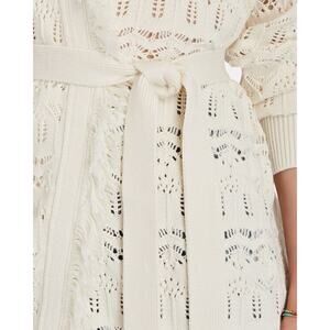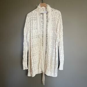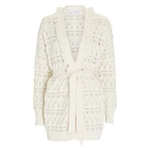 INTERMIX Brady Pointelle Silk-Cotton Wrap Cardigan, Size Large, Ivory Off White Color, Long Sleeves, Open Front, Fringe Detail, Open Knit, Long Length, Optional Adjustable Tie at Waist, Cotton Silk Cashmere Blend, Excellent Condition with No Flaws.