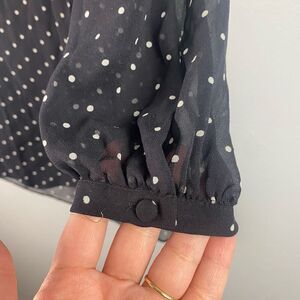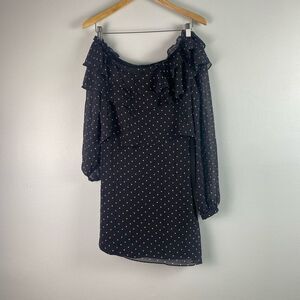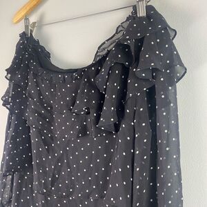 A ruffled one shoulder neckline gives this charming polka dot dress an elevated appeal. Elasticized at neckline. Overlays at bust. Sheer long sleeves with button cuffs. Lined. In black.