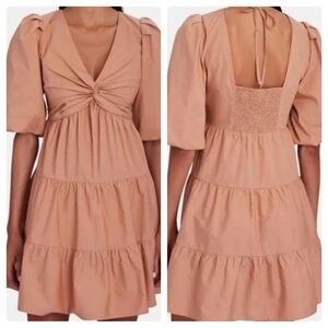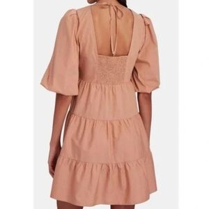 Puff Sleeves - Twisted V-neck bodice - Tiered babydoll silhouette - Tie back and concealed side zip closure - Color: Antique Rose / Dusty Rose Fabric: 100% cotton - Dry clean