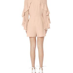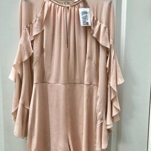 New with tags, never worn, Intermix ruffle sleeve romper in 100% silk. Concealed zipper closure in the back