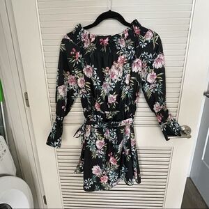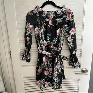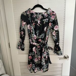 Intermix Floral Off the Shoulder Dress sz Small/Petite. Elasticized at off-the-shoulder cut neckline, flared long sleeve cuffs and waistline. Self tie bow detail .