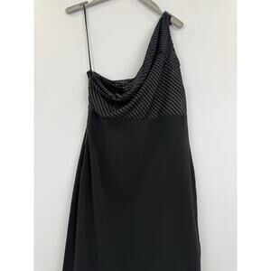 Sleeveless. One shoulder neckline with gold overlay. Fitted skirt with back slit. Exposed side zipper with hook-and-eye closure. Fully lined. 39" from shoulder to hemline. Made in the USA.