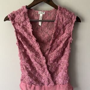 EUC - SEE NOTE INTIMATELY FREE PEOPLE 2 HAUTE 2 HANDLE ROSETTE FLORAL LACE BODYSUIT SIZE SMALL MAUVE NOTE: PURCHASED AS WHOLESALE “NWOT” but does have a perfume scent due to the box it was shipped in. “This formfitting eye-catching bodysuit features a plunging neckline, textured fabrication, chic cap sleeves and thong bottom. Lightweight. Mauve pink”