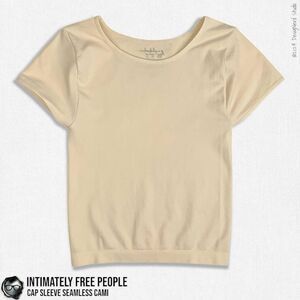 The cap sleeve seamless crop cami by Intimately Free People is an all season essential basic base layer. This form fitting, baby tee is ultra soft, seamless, and can be worn layered up or on its own. Alone, it has a crisp, refined look thanks to a micro ribbed hem. Intimately is Free People’s in-house label.