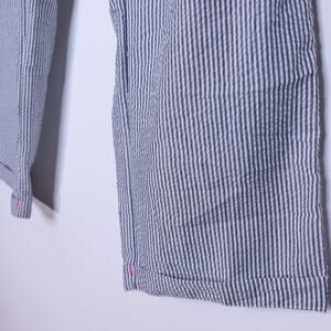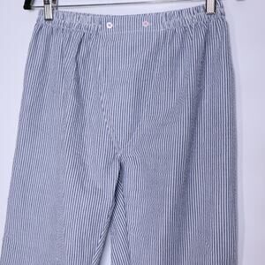Lightweight cotton textured pull-on pants in a denim blue and white pinstripe. An elastic waistband with decorative white buttons at the front and pink minimalist embroidery on the back and hem. Great lounging or sleepwear pants.