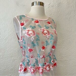 Sheer mesh cropped top. Embroidered floral. Ruffle hem. Dainty/fairy/feminine style. NWOT. Never worn. Excellent condition.