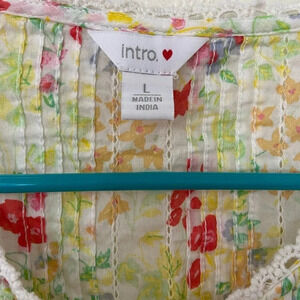 Beautiful light floral blouse with Pintuck detail and inset lace. Size Large. Brand Intro. Excellent preowned condition