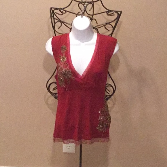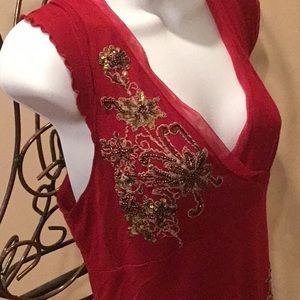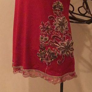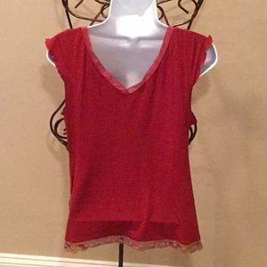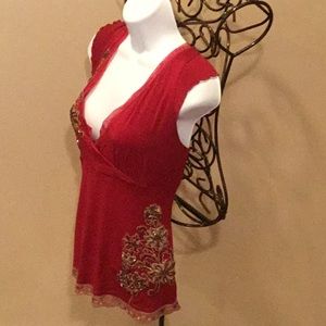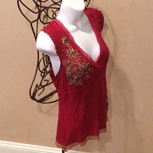 BEAUTIFUL DARK RED TOP WITH BEAD AND STITCH DESIGN ON THE FRONT. LACE AND ELEMENT DESIGN ON THE BOTTOM.