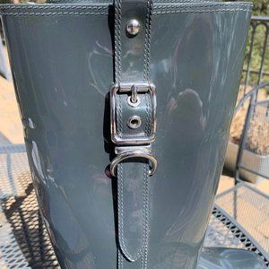 I believe the color is Titanium. Never worn. Excellent condition. Buckle accents. Glossy rubber rain boots. Those are not scuffs or discolored areas in some of the photos. Just the way the sun is hitting them. They're kind of an iridescent.