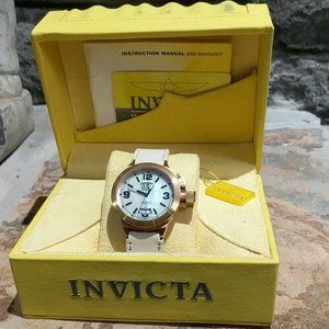 GORGEOUS color combination of rose gold steel case & white leather band. Strap buckle & crown engraved w/INVICTA logos.