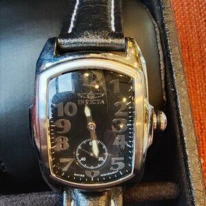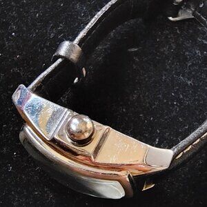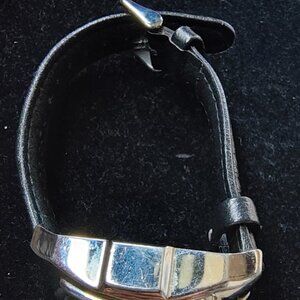 BAND: BLACK LEATHER Strap with clasp buckle.
