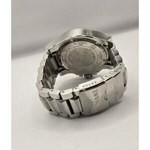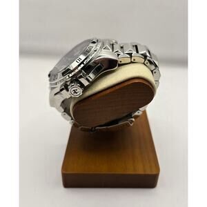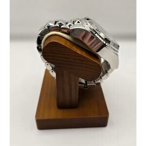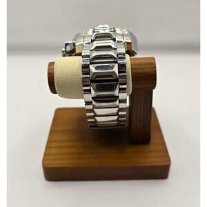 Minute markers around the outer rim. Luminescent hands and markers. Date display at the four o'clock position. Chronograph - three sub-dials displaying: 60 seconds, 30 minutes, and 1/10th of a second. Quartz movement. Scratch resistant flame fusion crystal. Texture steel crown.