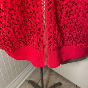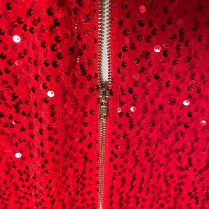 IN'VOLAND NWT Red Sequin fully lined jacket. Long sleeve with knit banding around bottom of sleeve, bottom of jacket, and around neck. Pockets in side seams made in same fabric as lining. Full gold toned zipper. Size 20W. 100% polyester.