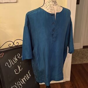 Gorgeous silk top - looks vintage - i believe it’s a mens top but could be worn unisex! One tiny spot at bottom as shown in last pic that is hardly noticeable when wearing - some very minor discoloration i believe from age on some of the edges but again it just appears as “washed silk” look and looks amazing on! So soft and quality silk!