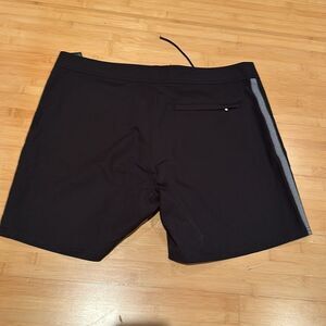 Stylish black swim shorts featuring a side stripe. Perfect for beach or pool days.