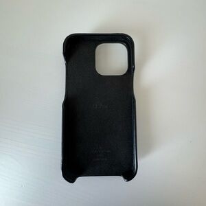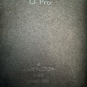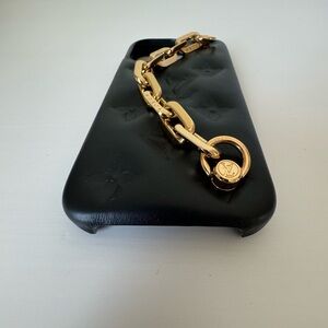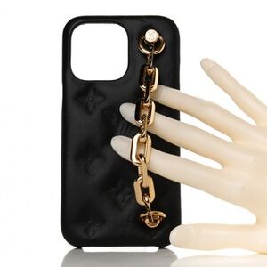 This is an authentic LOUIS VUITTON Lambskin Coussin iPhone 13 Pro Bumper in Black. This stylish case is finely crafted of monogram coated canvas, with a black microfiber lining and a gold chain hand grip on the back
