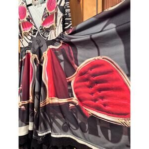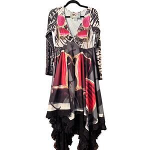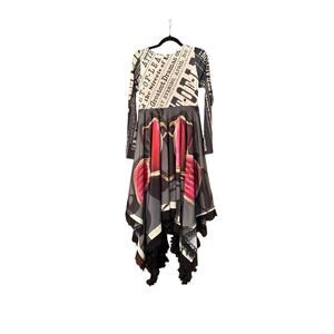 Keywords: AP dress, artful dress, London print dress, lace trim dress, handkerchief hem dress, long sleeve dress, bohemian dress, art to wear, statement dress, unique dress, printed dress, designer dress