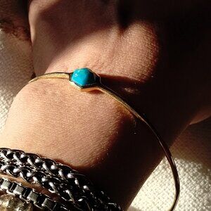 Turquoise two station bangle. The piece is cast in 18K gold and punctuated by two of the stones, each hand-cut into an Gelato shape and encased in a smooth bezel. It’s elegant worn in a stack with a mix of jeweled and unadorned bracelets, alike.