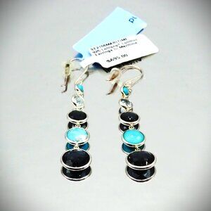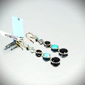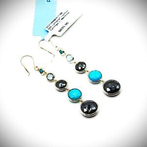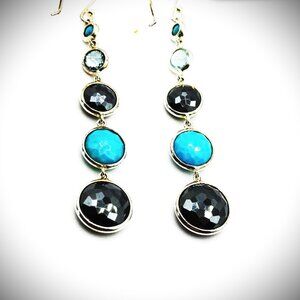 Ippolita design Lollipop Lollitini Collection sterling silver, faceted hematine doublets, turquoise, & aquamarine five stone Maritime dangle earrings are 12mm wide at widest point, 2" long, 2.5" drop with hook fastening.