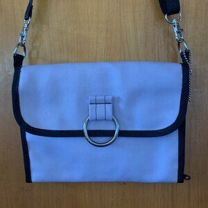 Lavender Faux Leather; 3 generous, zip compartments; fully adjustable shoulder strap, fold-over magnet closure. Never used! Like new condition.