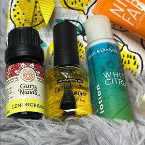 Vibrant lemon print cosmetic bag. Includes bath and body products. Perfect for a refreshing self-care routine.