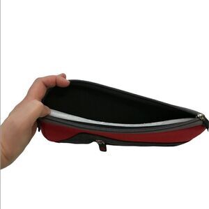 Burgundy IPad case, new in the wrapper. Black zipper closure in front. Colors are burgundy and black with red and white logos. Excellent condition with no flaws.