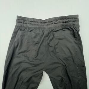 Comfortable and functional IRG scrub pants for women in a solid black shade. Made with a soft, breathable stretch blend featuring a relaxed fit, drawstring waistband, and utility side pocket. Perfect for work shifts, casual wear, or lounging. Excellent pre-owned condition.
