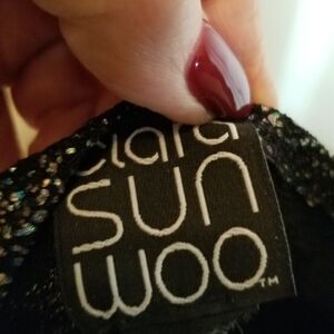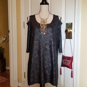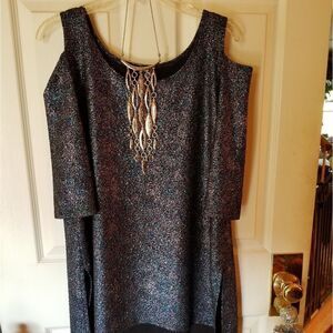 This cold shoulder piece is done by Ciara Sun Woo. It is mostly blue & silver but shimmers other colors with movement. It's a perfect piece for a date night or any dressy event. It's style is hi-low measuring 29" in back, 23" in front. The sleeves are 17" from the shoulder down. (including the cut-out). It was purchased at a high end boutique in the Borgata. Only worn once. Size L. EUC.