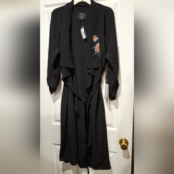 IRIS COVERUP NEW WITH TAGS BLACK WITH ROSE APPLIQUE ON LAPEL SIZE 3X BUT RUNS SMALL 23 INCHES PIT TO PIT