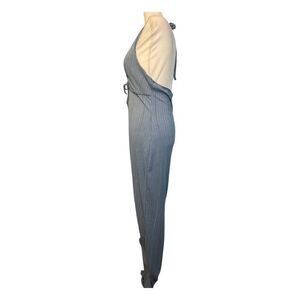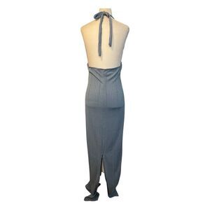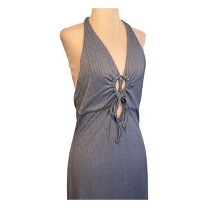 IRIS Halter Maxi Dress Blue Ribbed Knit Keyhole Tie Front Open Back L