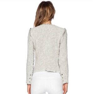 Description: This is a genuine IRO Agnette Jacket. The jacket features collarless neckline, front zip with snap button closure, light shoulder pads, intentionally distressed, long sleeves with zip and snap button sleeve hems, fringe detail at cuffs and hem, zip up side pockets, soft cotton blend fabric. Retail $480