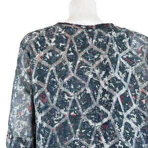 ♡ IRO 'Aliza' • Size FR 40 / US 8 ♡ Color: Silver Metallic + Black/Navy/Gray Sheer Slouchy/T-Shirt Fit • Sheer Sleeve • Side Slit Material: Silk, Nylon | Lining: 100% Polyester *Gently worn w/ some small patches in foil threading as shown, very faint/minor ♡ Measurements (flat unstretched) Pit to pit: 20” • Length: 31.5” • Sleeve: 11” ♡ Thanks for shopping small + sustainable! ♡ All items available for immediate purchase. ♡ No trades/modeling. Happy bundling! :D