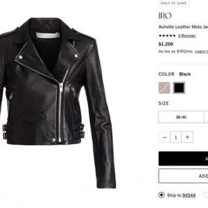 IRO Ashville Black Leather Moto Jacket, Size 42. Retail $1,200. This ultra-soft lamb leather jacket features adjustable waist belt buckles, two zipper pockets, a small triangle pocket with snap closure, zipper sleeves, snap-fastening epaulettes, and classic silvertone IRO-stamped hardware. Fully lined.