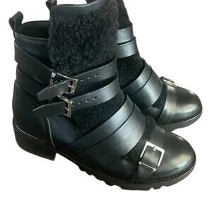 IRO Black Leather Shearling Ankle Boots 6.5 37 Lug Sole Hoonah Utility Strappy