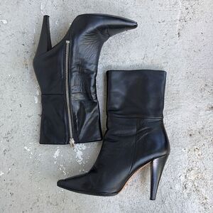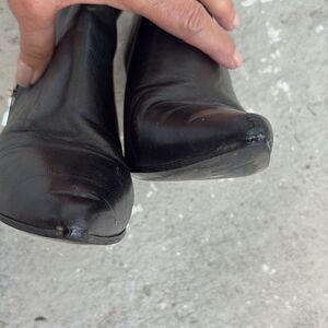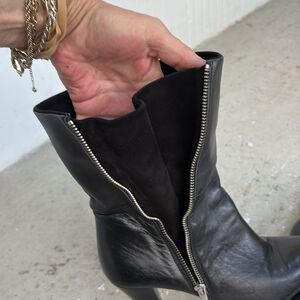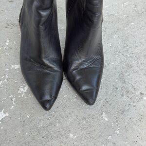Please look at the pictures. These are super cute ankle boots, but they are not perfect toes have scuffing which I show and so do heels. They have been resold. Shaft is approximately 7.5 shaft width is six, heel height is 4 inches.